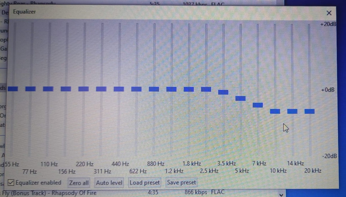 К слову, решил дать им наконец официальные имена. MyST StatAmp и MyST MyStatic Для тех, кто не в курсе и не следит за очень скудным освещением рождения данного комплекта, напомню, что усилитель уже какое-то время существует и даже прошёл проверку на нескольких сторонних наушниках. И в общем то он уже устаканился и будет производиться без изменений. Наушники же будут ещё дорабатываться. По причинам, описанным ниже. Итак, первые электростатические наушники от MyST (допустим, MyStatic-0) приходится слушать с некоторой коррекцией эквалайзера (см.рисунок). Без оной коррекции часть средних и высокие частоты явно сильно выпирают и к тому же быстро срываются в искажения. Слишком тонкая мембрана – не самое лучшее решение для наушников, доказано мировой практикой. Скорее всего придётся делать мембрану более толстой и жёсткой. Сразу скажу, я не самый фанат электростатов. Как по мне изодинамы во всем выше по уровню. И более собранные, и более "быстрые" по всему диапазону, и как-то умудряются быть более массивными по подаче даже тогда, когда звук не сильно басовитый. Ранее слушанные электростаты всегда были более нежными и легковесными, даже тогда, когда умудрялись быть слегка перебасованными. Им всем жутко не хватало именно ударности, чтоб показать напор. Басили они вроде неплохо, но "лупить" им никому не удавалось. Ну у тех, что мне доводилось слушать. Примерно тоже самое можно было сказать и про высокие и средние частоты. Они, будучи даже прозрачными и в целом детальными, не всегда адекватно справлялись с агрессивной, злой, яркой музыкой. Сразу чувствовалось, что не хватает напора и резкости. Сам характер отдавал легковесностью и избыточной "певучестью" что ли. Надо сказать, что в этом смысле MySTatic явно выделяются среди прочих. Их характер явно ближе к изодинамическому, чем у всех слышаных мной ранее. По крайней мере то, что касается средних и высоких частот. В них явно присутствует агрессия и злость при прослушивании металла. Что касается низких частот, они где-то на уровне смешения изодинамического и электростатического характера. Они явно плотнее и туже чем у Stax, но в целом в них слышится фирменный электростатовский характер. Несколько округлый и как будто слегка подкачанный. Самую малость. Но в тоже время у него нет той мягкотелости и избыточной "воздушности", которую я лично всегда воспринимал как манеру, делающую статы в принципе не пригодными для злой, агрессивной музыки. Я бы даже сказал, что они на удивление плотные и реально "качают", создавая не столько звук сколько вибрацию. И на самом деле они настолько адекватны металу, что я в течении двух дней только и делаю, что слушаю свой сборник и вообще не наблюдаю у себя ощущения диссонанса между манерой наушников и музыкой. В общем, за исключением детских проблем, судя по всему, связанных с лёгкостью и тонкостью мембраны (которые требуют некоторой коррекции эквалайзером дабы снизить яркость и не дать наушникам скатить в искажения), за исключением этого наушники вышли на удивление универсальными и с хорошим смешением отдельных плюсов изодинамы и статов. От статов мы имеем слегка округлый и подкачанный характер низких частот и общая "ясная", "светлая" манера подачи звука. А с изодинамами роднит общая схожая манера средних и высоких частот и некоторый упор на отчётливо и в какой-то мере даже резковато подаваемые ср